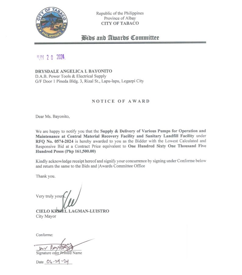 Notice of Award: Supply & Delivery of Various Pumps for Operation & Maintenance at Central Material Recovery Facility & Sanitary Landfill Facility, PR No. 24-05-0641 2024, Bids and Awards - Posted by: [ Melissa Biron] Download: Award Reso-24-05-0641 – D.A.B. Power Tools & Electrical Supply Download NOA-24-05-0641 – D.A.B. Power Tools & Electrical Supply Download PO-24-05-0641 – D.A.B. Power Tools & Electrical SupplyDownload
