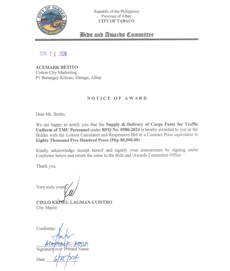 Notice of Award: Supply & Delivery of Cargo Pants for Traffic Uniform of TMU Personnel, PR No. 24-05-0648 2024, Bids and Awards - Posted by: [ Melissa Biron] Download: Award Reso-24-05-0648 – Cotton City Marketing Corp. Download NOA-24-05-0648 – Cotton City Marketing Corp. Download PO-24-05-0648 – Cotton City Marketing Corp.Download