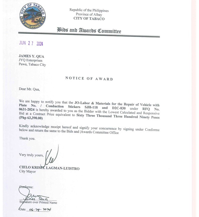 Notice of Award: JO-Labor & Materials for the Repair of Vehicle with Plate No./Conduction Stickers SJH-118 & D2C-830, PR No. 24-06-0706 2024, Bids and Awards - Posted by: [ Melissa Biron] Download: Award Reso-24-06-0706 – JYQ Enterprises Download NOA-24-06-0706 – JYQ Enterprises Download PO-24-06-0706 – JYQ EnterprisesDownload