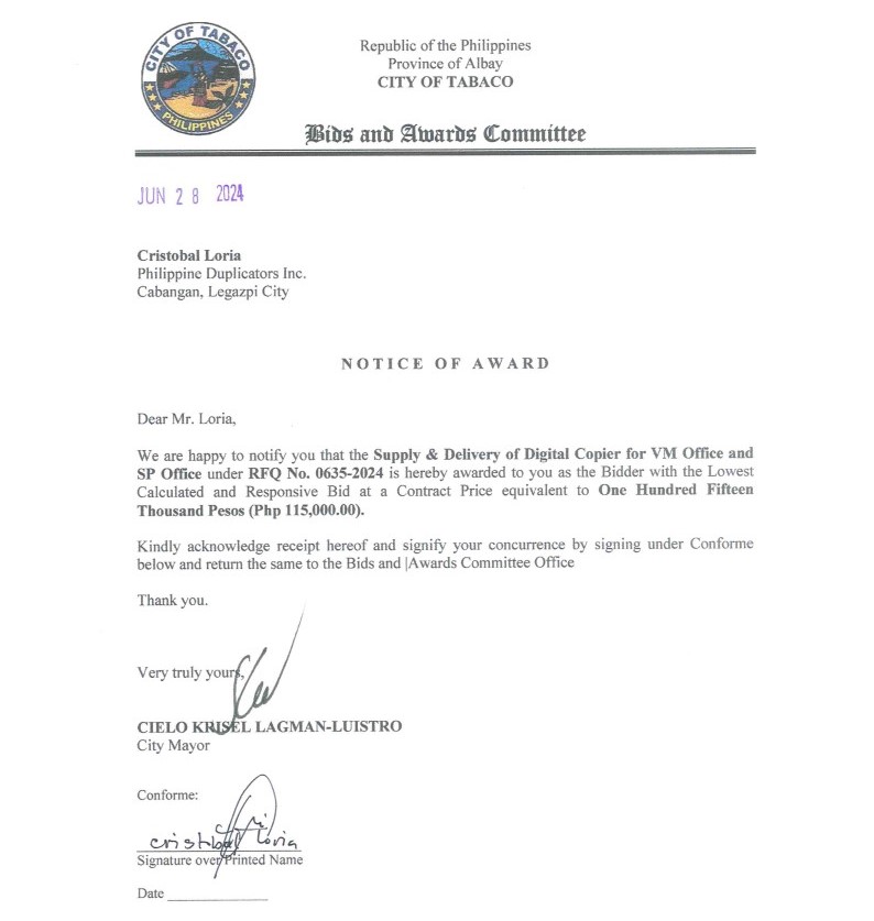 Notice of Award: Supply & Delivery of Digital Copier for VM Office & SP Office, PR No. 24-06-0712 2024, Bids and Awards - Posted by: [ Melissa Biron] Download: Award Reso-24-06-0712 – Philippine Duplicators Inc. Download NOA-24-06-0712 – Philippine Duplicators Inc. Download PO-24-06-0712 – Philippine Duplicators Inc.Download