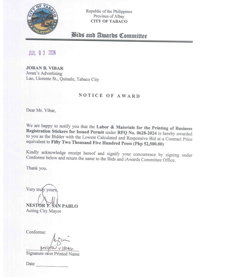 Notice of Award: Labor & Materials for the Printing of Business Registration Stickers for Issued Permit, PR No. 24-06-0703 2024, Bids and Awards - Posted by: [ Melissa Biron] Download: Award Reso-24-06-0703 – Joran’s Advertising Download NOA-24-06-0703 – Joran’s Advertising Download PO-24-06-0703 – Joran’s AdvertisingDownload