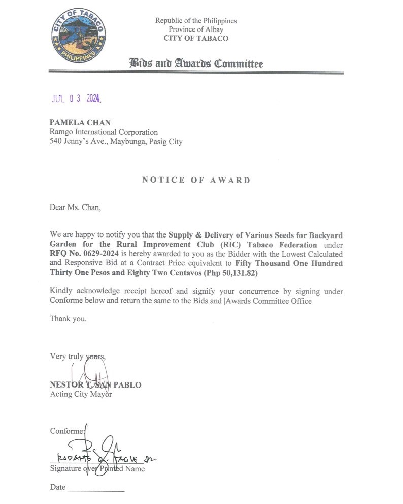 Notice of Award: Supply & Delivery of Various Seeds for Backyard Garden for the Rural Improvement Club (RIC) Tabaco Federation, PR No. 24-06-0704 2024, Bids and Awards - Posted by: [ Melissa Biron] Download: Award-Reso-24-06-0704 – Ramgo International Corporation Download NOA-24-06-0704 – Ramgo International Corporation Download PO-24-06-0704 – Ramgo International CorporationDownload