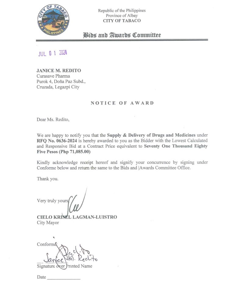 Notice of Award: Supply & Delivery of Drugs & Medicines, PR No. 24-06-0713 2024, Bids and Awards - Posted by: [ Melissa Biron] Download: Award Reso-24-06-0713 – Curasave Pharma Download NOA-24-06-0713 – Curasave Pharma Download PO-24-06-0713 – Curasave PharmaDownload