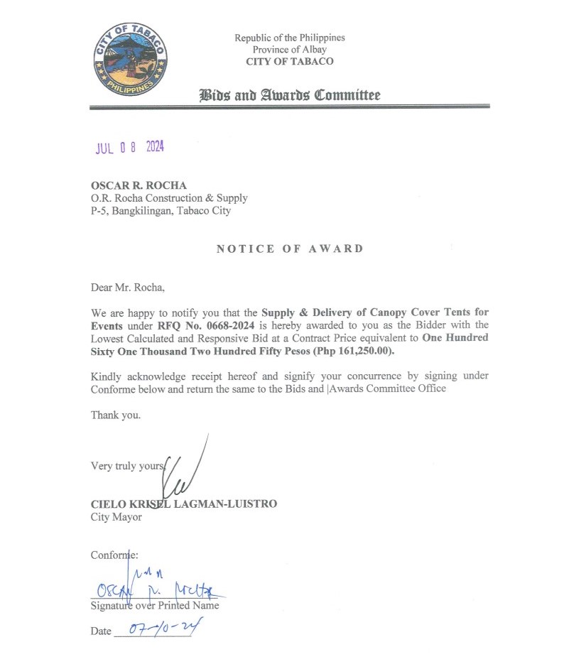 Notice of Award: Supply & Delivery of Canopy Cover Tents for Events, PR No. 24-06-0745 2024, Bids and Awards - Posted by: [ Melissa Biron] Download: Award Reso-24-06-0745 – O.R Rocha Construction & Supply Download NOA-24-06-0745 – O.R Rocha Construction & Supply Download PO-24-06-0745 – O.R Rocha Construction & SupplyDownload