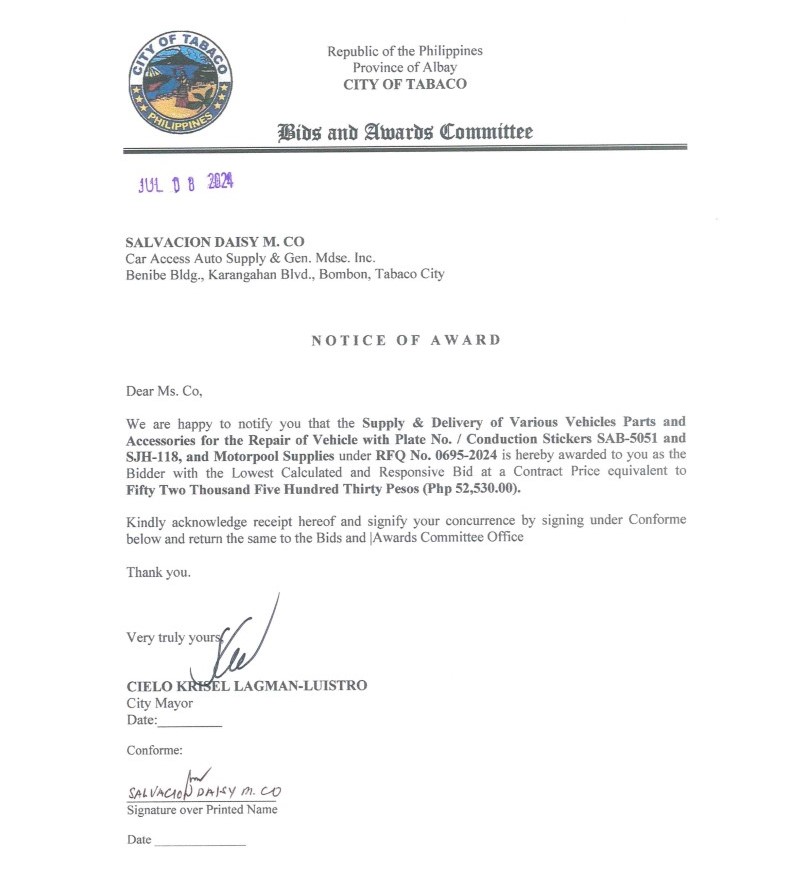 Notice of Award: Supply & Delivery of Various Vehicle Parts & Accessories for the Repair of Vehicle with Plate No./Conduction Stickers SAB-5051 & SJH-118, and Motorpool Supplies, PR No. 24-06-0780