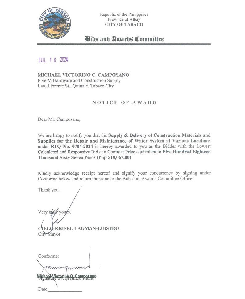 Notice of Award: Supply & Delivery of Construction Materials & Supplies for the Repair & Maintenance of Water System at Various Location, PR No. 24-07-0789 2024, Bids and Awards - Posted by: [ Melissa Biron] Download: Award Reso-24-07-0789 – Five M Hardware & Construction Supply Download NOA-24-07-0789 – Five M Hardware & Construction Supply Download PO-24-07-0789 – Five M Hardware & Construction SupplyDownload