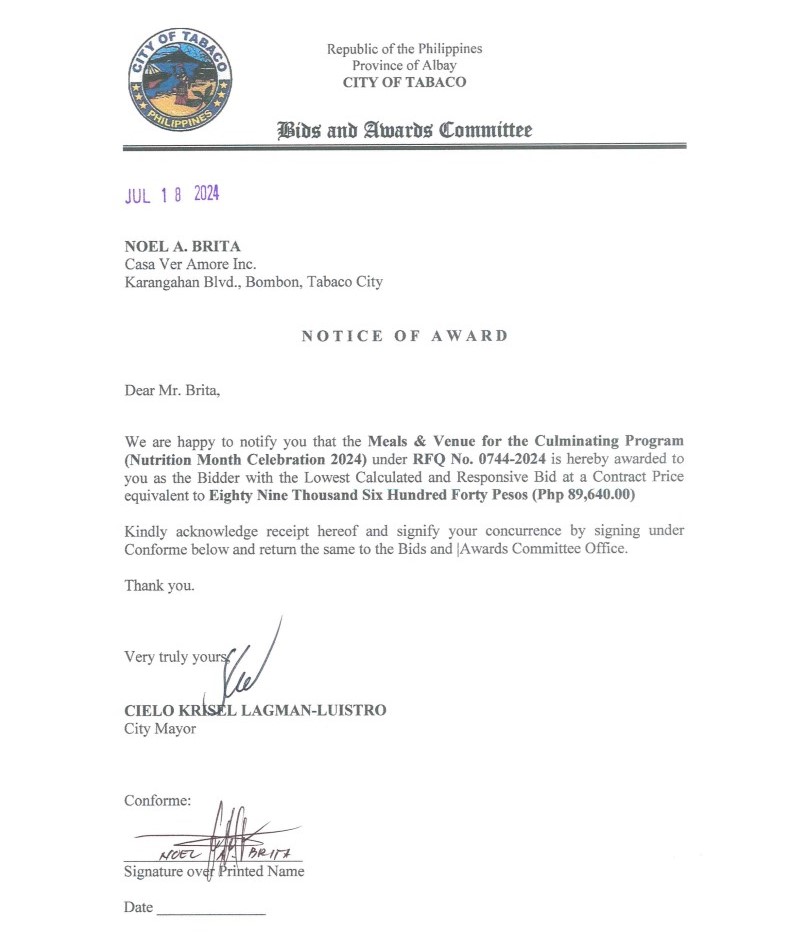 • REQUEST FOR QUOTATION (RFQ)- The City Government of Tabaco through its Bids and Awards Committee (BAC), intends to procure "Supply & Delivery of Meals during Training and Games during the ECL Memorial Cup Season II" with an Approved Budget for the Contract (ABC) amounting to Two Hundred Sixteen Thousand, Seven Hundred Fifty Pesos (Php 216,750.00) through Section 34 Small Value Procurement of the Implementing Rules and Regulations of RA No. 12009.