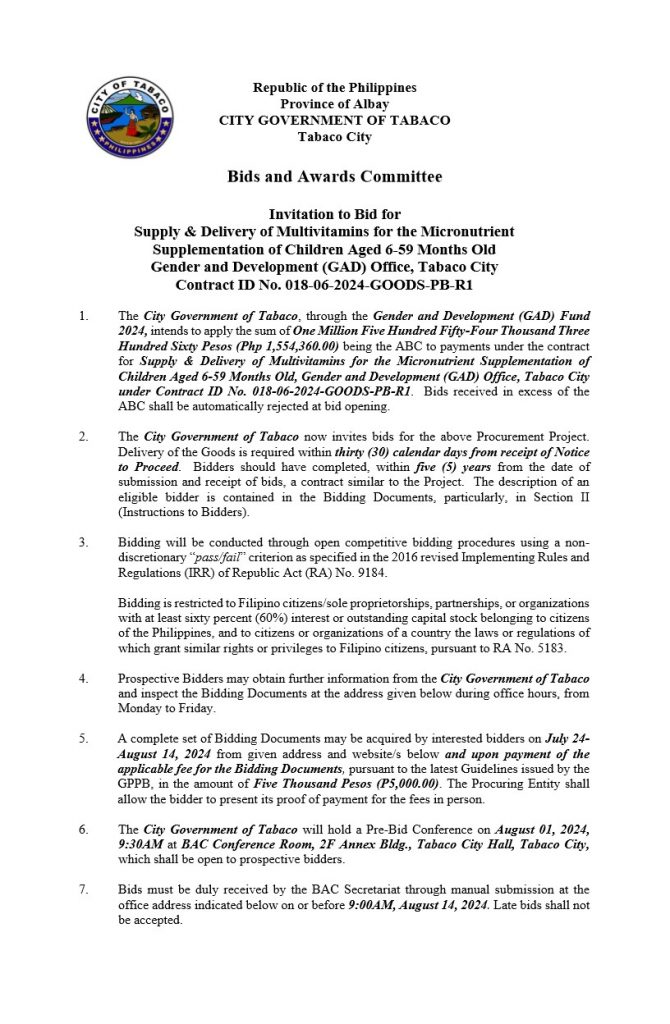 Invitation to Bid: Supply & Delivery of Multivitamins for the Micronutrient Supplementation of Children Aged 6-59 Months Old Gender and Development (GAD) Office, Tabaco City, Contract ID No. 018-06-2024-GOODS-PB-R1