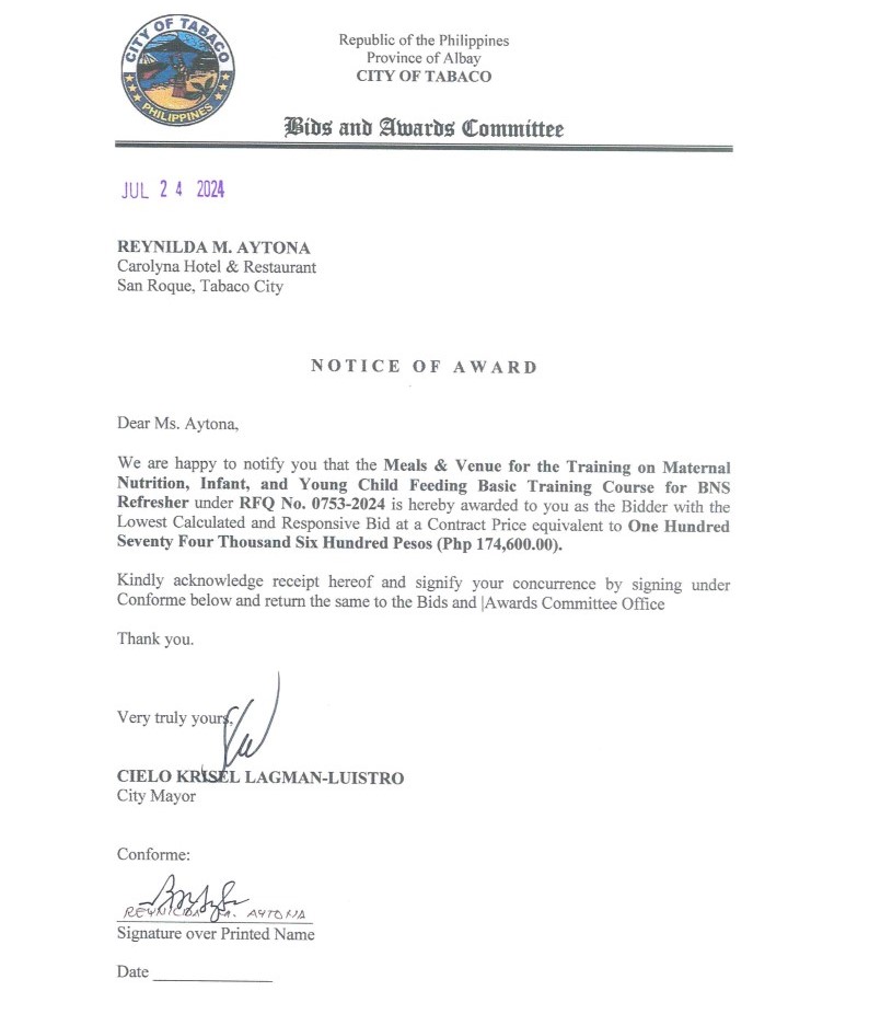 Notice of Award: Meals & Venue for the Training on Maternal Nutrition, Infant, & Young Child Feeding Basic Training Course for BNS Refresher, PR No. 24-07-0848 2024, Bids and Awards - Posted by: [ Melissa Biron] Download: Award Reso-24-07-0848 – Carolyna Hotel & Restaurant Download NOA-24-07-0848 – Carolyna Hotel & Restaurant Download PO-24-07-0848 – Carolyna Hotel & RestaurantDownload
