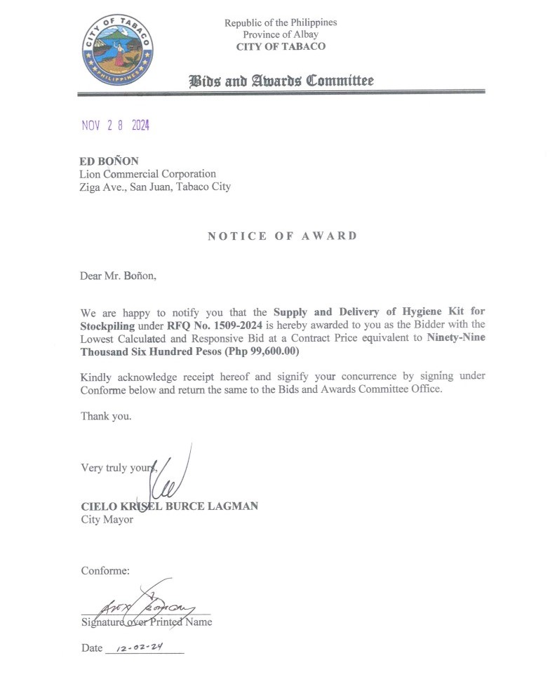 Notice of Award: Supply & Delivery of Hygiene Kit for Stockpiling, PR No. 24-11-1579