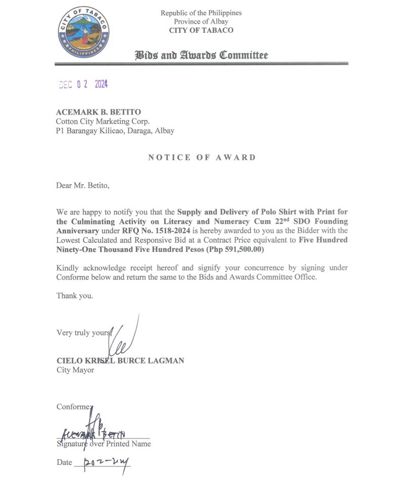 Notice of Award: Supply & Delivery of Polo Shirt with Print for the Culminating Activity on Literacy & Numeracy cum 22nd SDO Founding Anniversary, PR No. 24-11-1698 2024, Bids and Awards - Posted by: [ Melissa Biron] Download: Award Reso-24-11-1698 – Cotton City Marketing Corp. Download NOA-24-11-1698 – Cotton City Marketing Corp. Download PO-24-11-1698 – Cotton City Marketing Corp.Download