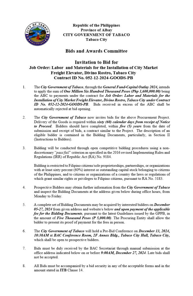 Invitation to Bid for Job Order: Labor and Materials for the Installation of City Market Freight Elevator, Divino Rostro, Tabaco City, Contract ID No. 052-12-2024-GOODS-PB