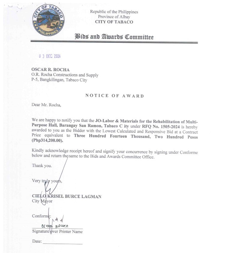 Notice of Award: JO-Labor & Materials for the Rehabilitation of Multi-Purpose Hall, Barangay San Ramon, Tabaco City, PR No. 24-11-1684 2024, Bids and Awards - Posted by: [ Melissa Biron] Download: Award Reso-24-11-1684 – O.R. Rocha Construction & Supply Download NOA-24-11-1684 – O.R. Rocha Construction & Supply Download PO-24-11-1684 – O.R. Rocha Construction & SupplyDownload