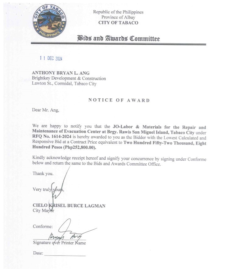 Notice of Award: JO-Labor & Materials for the Repair & Maintenance of Evacuation Center at Brgy. Rawis San Miguel Island, Tabaco City, PR No. 24-11-1795 2024, Bids and Awards - Posted by: [ Melissa Biron] Download: Award Reso-24-11-1795 – Brightkey Development & Construction Download NOA-24-11-1795 – Brightkey Development & Construction Download PO-24-11-1795 – Brightkey Development & ConstructionDownload