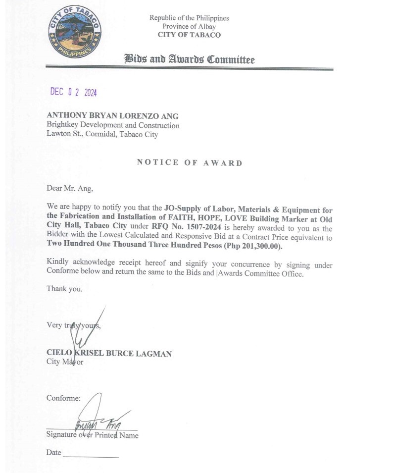 Notice of Award: JO-Supply of Labor, Materials & Equipment for the Fabrication & Installation of FAITH, HOPE, LOVE Building Marker at Old City Hall, Tabaco City, PR No. 24-11-1686