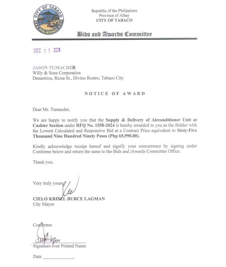 Notice of Award: Supply & Delivery of Airconditioner Unit at Cashier Section, PR No. 24-11-1738 2024, Bids and Awards - Posted by: [ Melissa Biron] Download: Award Reso-24-11-1738 – Willy & Sons Corporation Download NOA-24-11-1738 – Willy & Sons Corporation Download PO-24-11-1738 – Willy & Sons CorporationDownload