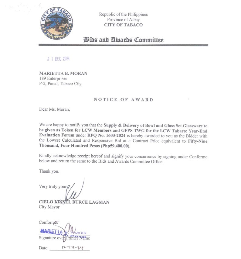 Notice of Award: Supply & Delivery of Bowl & Glass Set Glassware to be given as Token for LCW Members & GFPS TWG for the LCW Tabaco: Year End Evaluation Form, PR No. 24-11-1784 2024, Bids and Awards - Posted by: [ Melissa Biron] Download: Award Reso-24-11-1784 – 189 Enterprises Download NOA-24-11-1784 – 189 Enterprises Download PO-24-11-1784 – 189 EnterprisesDownload