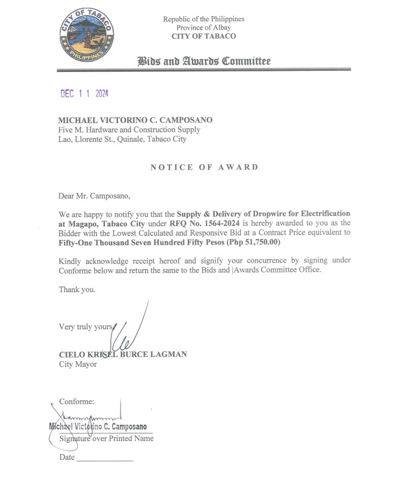 Notice of Award: Supply & Delivery of Dropwire for Electrification at Magapo, Tabaco City, PR No. 24-11-1744 2024, Bids and Awards - Posted by: [ Melissa Biron] Download: Award Reso-24-11-1744 – Five M Hardware & Construction Supply Download NOA-24-11-1744 – Five M Hardware & Construction Supply Download PO-24-11-1744 – Five M Hardware & Construction SupplyDownload