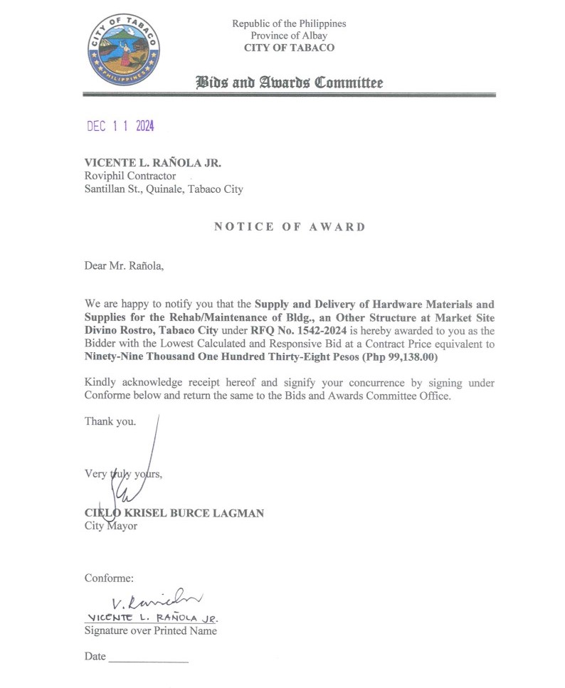 Notice of Award: Supply & Delivery of Hardware Materials & Supplies for the Rehab/Maintenance of Bldg., & Other Structure at Market Site Divino Rostro, Tabaco City, PR No. 24-11-1722 2024, Bids and Awards - Posted by: [ Melissa Biron] Download: Award Reso-24-11-1722 – Roviphil Contractor Download NOA-24-11-1722 – Roviphil Contractor Download PO-24-11-1722 – Roviphil ContractorDownload