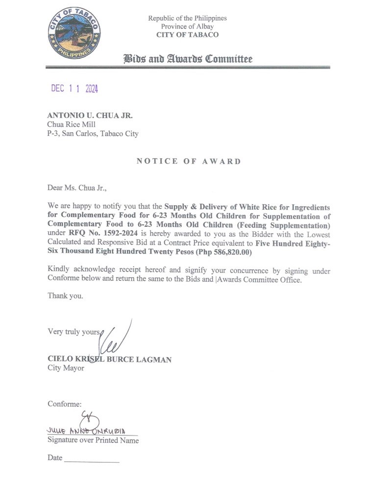 Notice of Award: Supply & Delivery of White Rice for Ingredients for Complementary Food for 6-23 Months Old Children for Supplementation of Complementary Food to 6-23 Months Old Children (Feeding Supplementation), PR No. 24-11-1772
