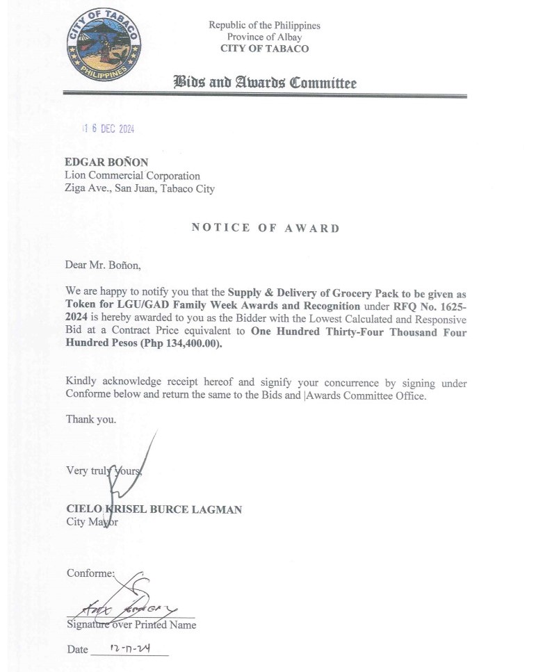Notice of Award: Supply & Delivery of Grocery Pack to be given as Token for LGU/GAD Family Week Awards & Recognition, PR No. 24-11-1807 2024, Bids and Awards - Posted by: [ Melissa Biron] Download: Award Reso-24-11-1807 – Lion Commercial Corporation Download NOA-24-11-1807 – Lion Commercial Corporation Download PO-24-11-1807 – Lion Commercial CorporationDownload