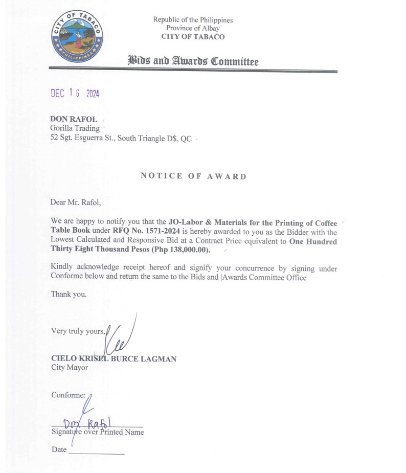 Notice of Award: JO-Labor & Materials for the Printing of Coffee Table Book, PR No. 24-11-1751 2024, Bids and Awards - Posted by: [ Melissa Biron] Download: Award Reso-24-11-1751 – Gorilla Trading Download NOA-24-11-1751 – Gorilla Trading Download PO-24-11-1751 – Gorilla TradingDownload