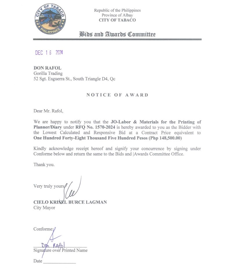 Notice of Award: JO-Labor & Materials for the Printing of Planner/Diary, PR No. 24-11-1750 2024, Bids and Awards - Posted by: [ Melissa Biron] Download: Award Reso-24-11-1750 – Gorilla Trading Download NOA-24-11-1750 – Gorilla Trading Download PO-24-11-1750 – Gorilla TradingDownload