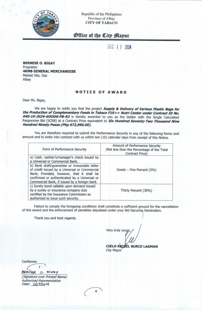 NOTICE OF AWARD: Supply & Delivery of Various Plastic Bags for the Production of Complementary Foods in Tabaco F1K++ Nutri Center, Contract ID No. 040-10-2024-GOODS-PB 2024, Bids and Awards - Posted by: [ Melissa Biron] Notice of Award-040-R2Download BAC-Reso-Award-040-R2Download