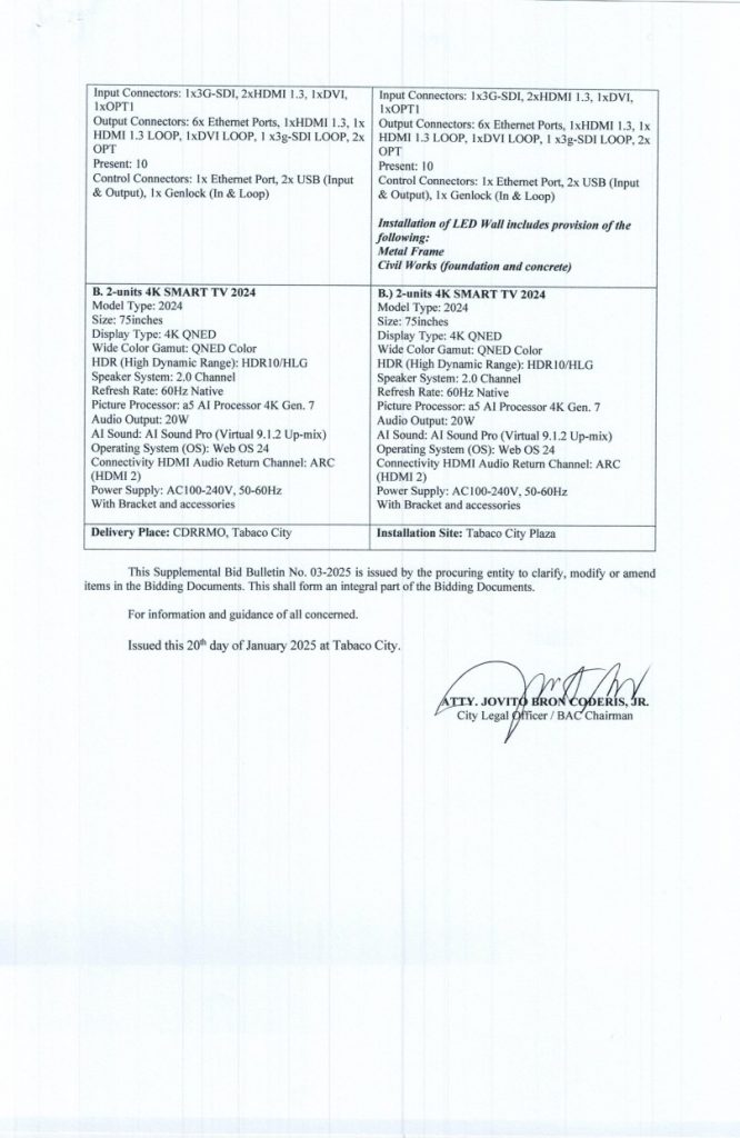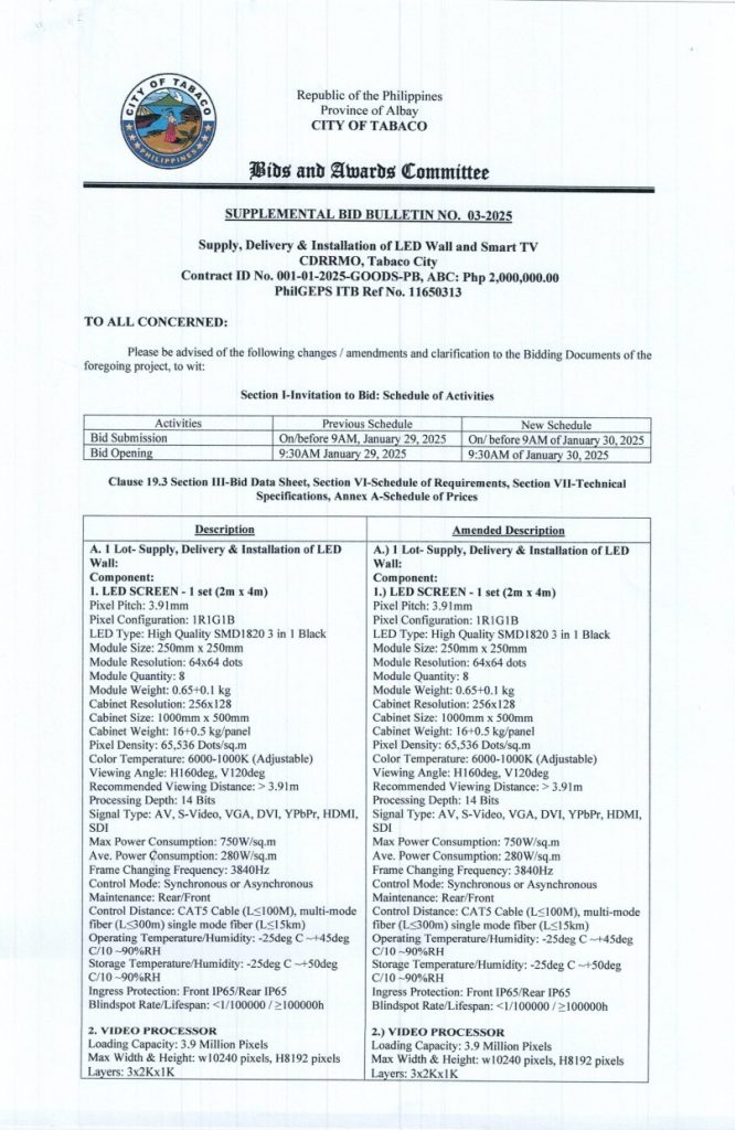 SUPPLEMENTAL BID BULLETIN NO. 03-2025 Supply, Delivery & Installation of LED Wall and Smart TV, CDRRMO, Tabaco City, Contract ID No. 001-01-2025-GOODS-PB
