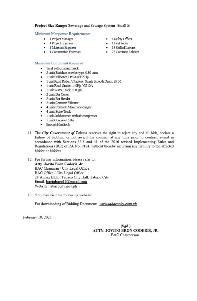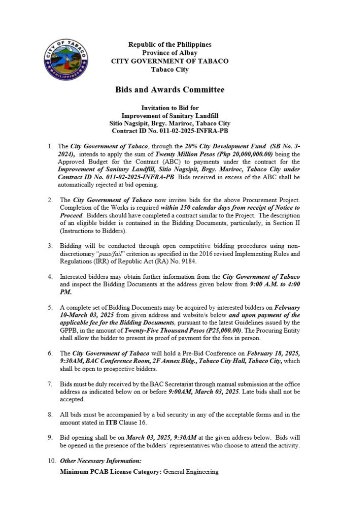 Invitation to Bid for Improvement of Sanitary Landfill Sitio Nagsipit, Brgy. Mariroc, Tabaco City Contract ID No. 011-02-2025-INFRA-PB