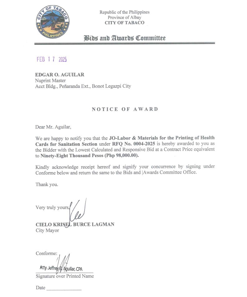 Notice of Award: JO-Labor & Materials for the Printing of Health Cards for Sanitation Section, PR No. 25-01-0011 2025, Bids and Awards - Posted by: [ Melissa Biron] Download: Award Reso-25-01-0011 – Nuprint Master Download Notice of Award-25-01-0011 – Nuprint Master Download Purchase Order-25-01-0011 – Nuprint MasterDownload