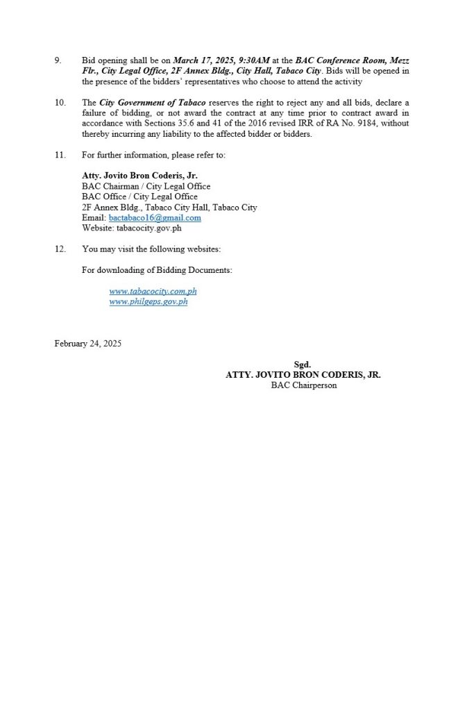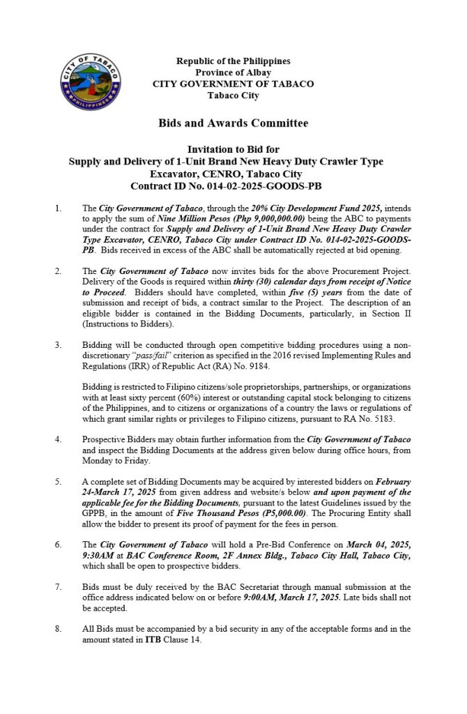 Invitation to Bid for Supply and Delivery of 1-Unit Brand New Heavy Duty Crawler Type Excavator, CENRO, Tabaco City, Contract ID No. 014-02-2025-GOODS-PB 2025, Bids and Awards - Posted by: [ Melissa Biron] Invitation to Bid-ID-No.-014-02-2025-GOODS-PBDownload Bidding Documents: PBD-Contract-ID-No.-014-02-2025-GOODS-PBDownload