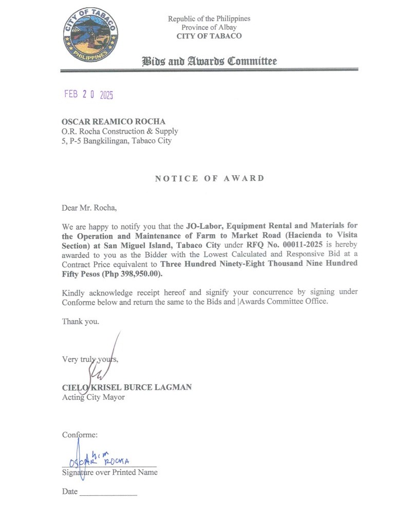 Notice of Award: JO-Labor, Equipment Rental & Materials for the Operation & Maintenance of Farm to Market Road (Hacienda to Visita Section) at San Miguel Island, Tabaco City, PR No. 25-02-0020