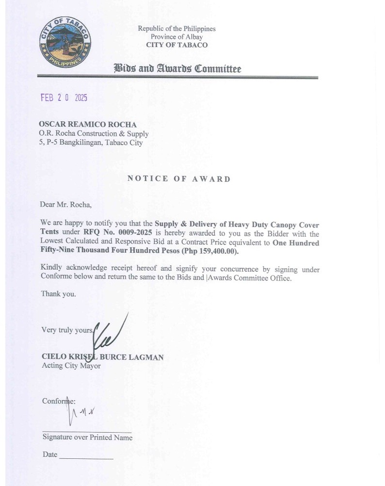 Notice of Award: Supply & Delivery of Heavy Duty Canopy Cover Tents, PR No. 25-02-0018 2025, Bids and Awards - Posted by: [ Melissa Biron] Download: Award Reso-25-02-0018 – O.R. Rocha Construction & Supply Download Notice of Award-25-02-0018 – O.R. Rocha Construction & Supply Download Purchase Order-25-02-0018 – O.R. Rocha Construction & SupplyDownload
