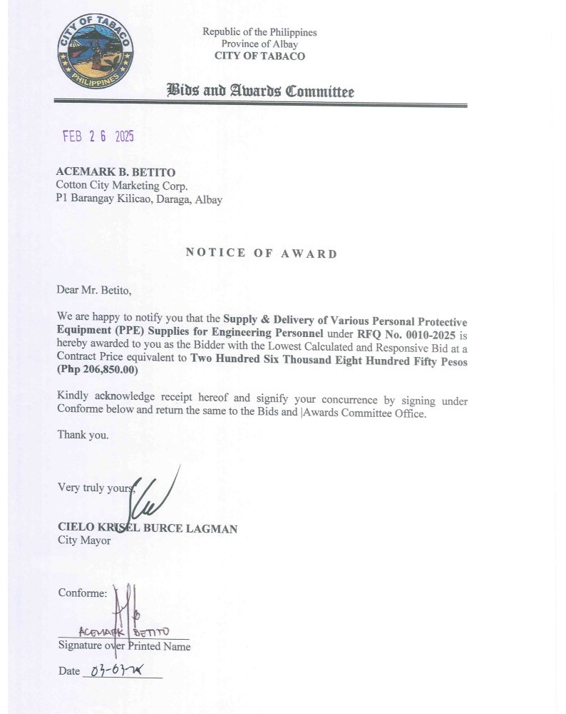 Notice of Award: Supply & Delivery of Various Personal Protective Equipment (PPE) Supplies for Engineering Personnel, PR No. 25-02-0019 2025, Bids and Awards - Posted by: [ Melissa Biron] Download: Award Reso-25-02-0019 – Cotton City Marketing Corp. Download Notice of Award-25-02-0019 – Cotton City Marketing Corp. Download Purchase Order-25-02-0019 – Cotton City Marketing Corp.Download