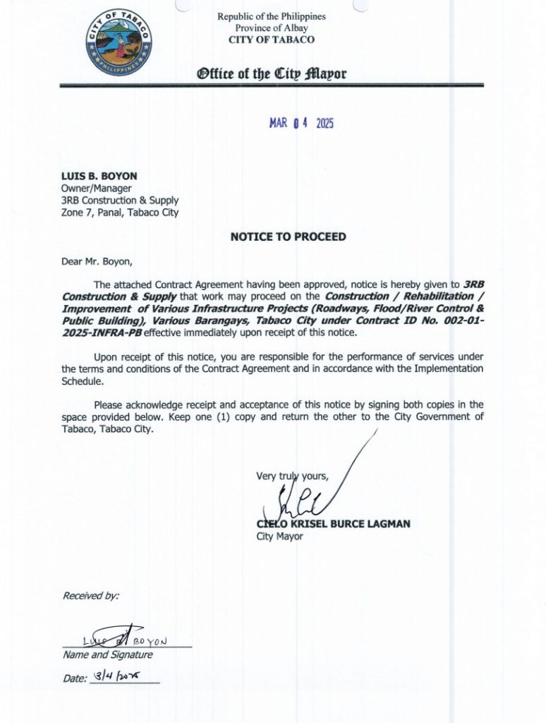 NOTICE TO PROCEED: Construction / Rehabilitation / Improvement of Various Infrastructure Projects (Roadways, Flood/River Control & Public Building), Various Barangays, Tabaco City under Contract ID No. 002-01-2025-INFRA-PB