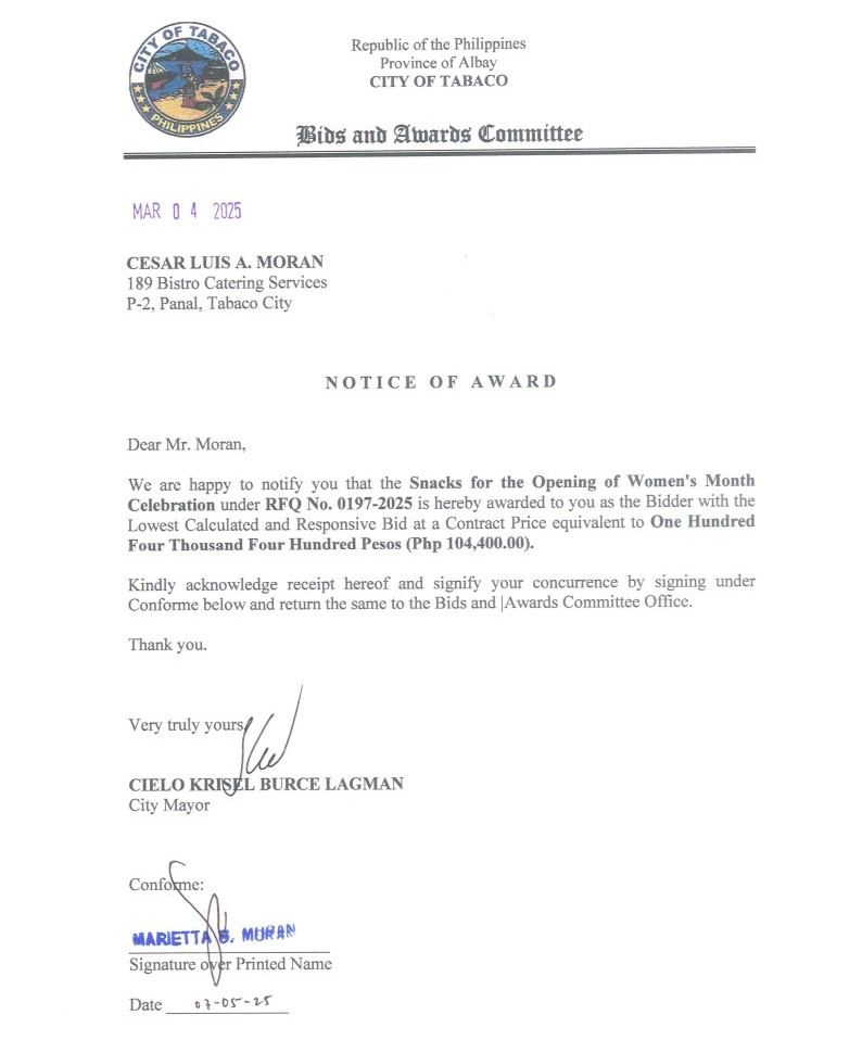 Notice of Award: Snacks for the Opening of Women’s Month Celebration, PR No. 25-02-0223 2025, Bids and Awards - Posted by: [ Melissa Biron] Download: Award Reso-25-02-0223 – 189 Bistro Catering ServicesDownload Notice of Award-25-02-0223 – 189 Bistro Catering Services Download Purchase Order-25-02-0223 – 189 Bistro Catering Services Download
