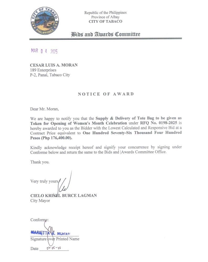 Notice of Award: Supply & Delivery of Tote Bag to be given as Token for Opening of Women’s Month Celebration, PR No. 25-02-0224 2025, Bids and Awards - Posted by: [ Melissa Biron] Download: Award Reso-25-02-0224 – 189 EnterprisesDownload Notice of Award-25-02-0224 – 189 Enterprises Download Purchase Order-25-02-0224 – 189 Enterprises Download