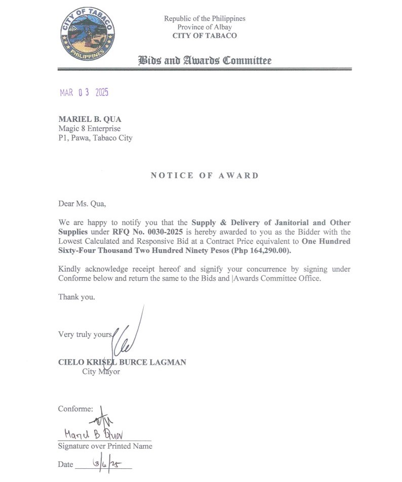 • REQUEST FOR QUOTATION (RFQ)- The City Government of Tabaco through its Bids and Awards Committee (BAC), intends to procure "Supply & Delivery of Polyethylene Plastics and Garbage Bags for the Operationalization of Nutrition Office and Tabaco F1k++ Nutri Center" with an Approved Budget for the Contract (ABC) amounting to Three Hundred Ninety-Nine Thousand, One Hundred Twenty-Five Pesos (Php 399,125.00) through Section 34 Small Value Procurement of the Implementing Rules and Regulations of RA No. 12009.