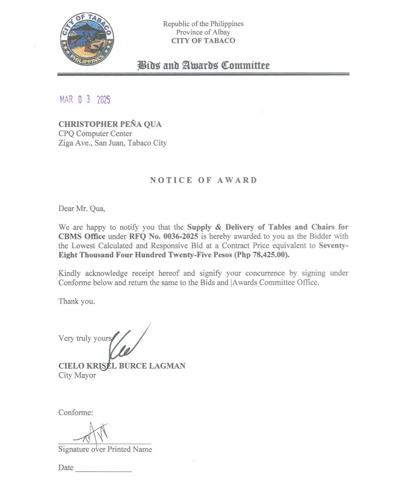 Notice of Award: Supply & Delivery of Tables & Chairs for CBMS Office, PR No. 25-02-0049 2025, Bids and Awards - Posted by: [ Melissa Biron] Download: Award Reso-25-02-0049 – CPQ Computer CenterDownload Notice of Award-25-02-0049 – CPQ Computer Center Download Purchase Order-25-02-0049 – CPQ Computer Center Download