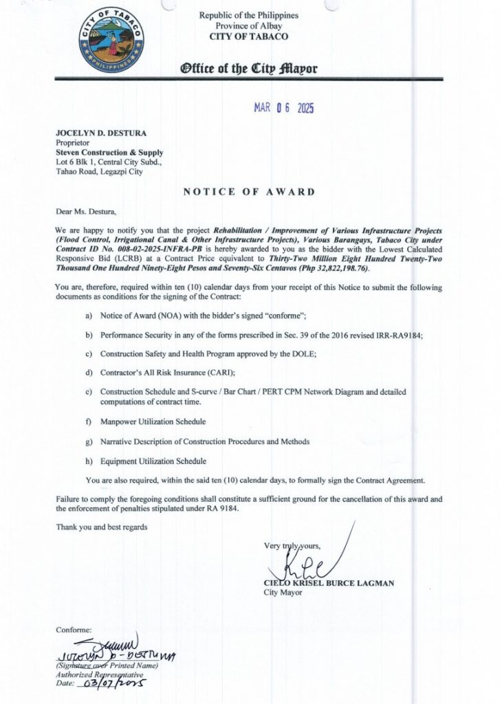 Notice of Award: Rehabilitation / Improvement of Various Infrastructure Projects (Flood Control, Irrigational Canal & Other Infrastructure Projects), Various Barangays, Tabaco City under Contract ID No. 008-02-2025-INFRA-PB