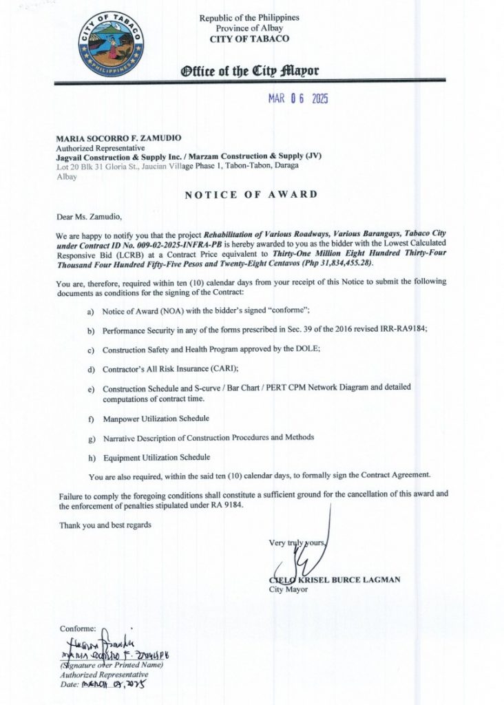 Notice of Award: Rehabilitation of Roadways, Various Barangays, Tabaco City under Contract ID No. 009-02-2025-INFRA-PB