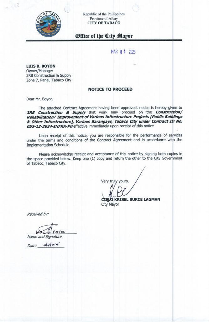 NOTICE TO PROCEED: Construction/ Rehabilitation/ Improvement of Various Infrastructure Projects (Public Buildings & Other Infrastructure), Various Barangays, Tabaco City, Contract ID No. 053-12-2024-INFRA-PB 2025, Bids and Awards - Posted by: [ Melissa Biron] Notice to Proceed-053Download Contract-053Download