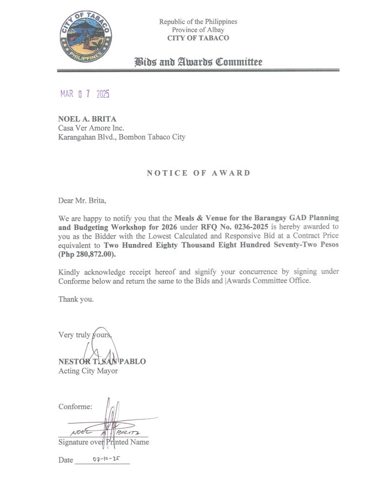 • INVITATION TO BID (ITB)- The City Government of Tabaco, through the GF MOOE (GAD 2026) intends to apply the sum of One Million One Hundred Thirty Thousand Five Hundred Eighty Pesos and 00/100 (Php1,130,580.00) being the Approved Budget for the Contract (ABC), to payments under the contract for Supply and Delivery of Feeding Supplementation for Senior Citizens (Fuel for Seniors & TB Warriors) with Contract ID CB_GOODS_2026-04-0002.