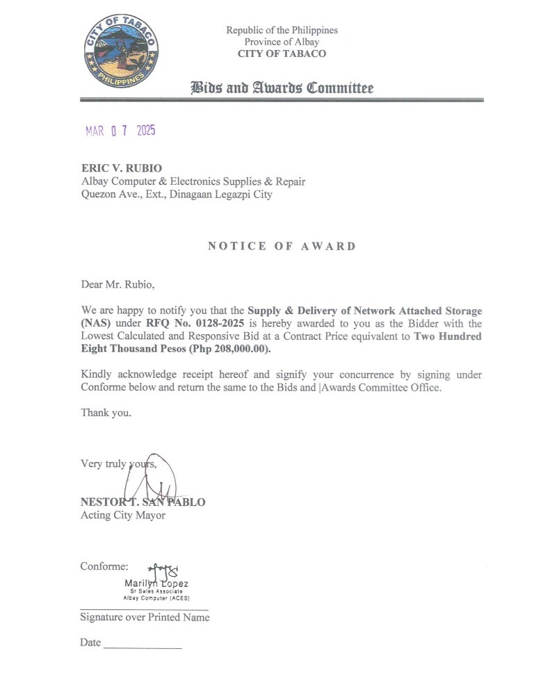 Notice of Award: Supply & Delivery of Network Attached Storage (NAS), PR No. 25-02-0142 2025, Bids and Awards - Posted by: [ Melissa Biron] Download: Award Reso-25-02-0142 – Albay Computer & Electronics Supplies & RepairDownload Notice of Award-25-02-0142 – Albay Computer & Electronics Supplies & Repair Download Purchase Order-25-02-0142 – Albay Computer & Electronics Supplies & Repair Download