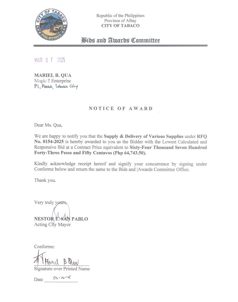 • INVITATION TO BID (ITB)- The City Government of Tabaco, through the GF MOOE (GAD 2026) intends to apply the sum of One Million One Hundred Thirty Thousand Five Hundred Eighty Pesos and 00/100 (Php1,130,580.00) being the Approved Budget for the Contract (ABC), to payments under the contract for Supply and Delivery of Feeding Supplementation for Senior Citizens (Fuel for Seniors & TB Warriors) with Contract ID CB_GOODS_2026-04-0002.