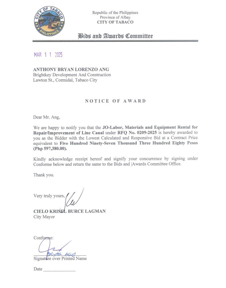• NOTICE OF AWARD (NOA)- TO O.R. ROCHA CONSTRUCTIONS AND SUPPLY FOR "Job Order-Labor, Materials and Equipment for the Fabrication and Installation of Early Warning Device / Signages" with an Approved Budget for the Contract (ABC) amounting to Nine Hundred Ninety-Nine Thousand, Eight Hundred Eighteen Pesos (Php 999,818.00) through Section 34 Small Value Procurement of the Implementing Rules and Regulations of RA No. 12009.