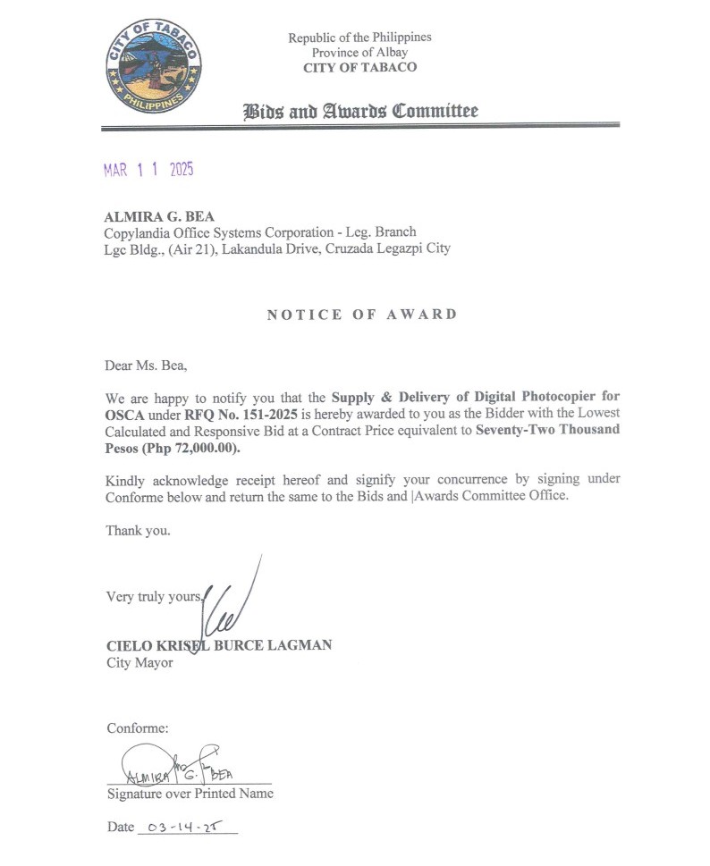 Notice of Award: Supply & Delivery of Digital Photocopier for OSCA, PR No. 25-02-0165 2025, Bids and Awards - Posted by: [ Melissa Biron] Download: Award Reso-25-02-0165 – Copylandia Office Systems Corporation-Leg. BranchDownload Notice of Award-25-02-0165 – Copylandia Office Systems Corporation-Leg. Branch Download Purchase Order-25-02-0165 – Copylandia Office Systems Corporation-Leg. Branch Download