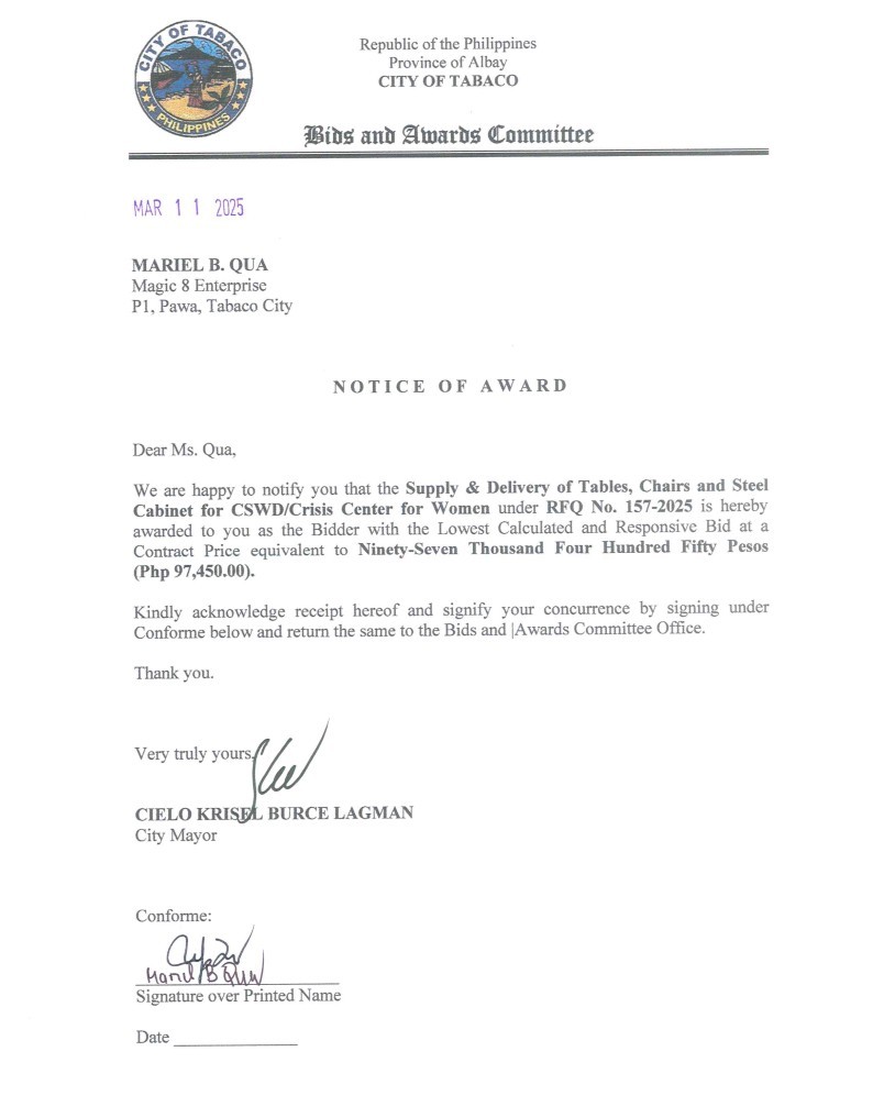 Notice of Award: Supply & Delivery of Tables, Chairs & Steel Cabinet for CSWD/Crisis Center for Women, PR No. 25-02-0171 2025, Bids and Awards - Posted by: [ Melissa Biron] Download: Award Reso-25-02-0171 – Magic 8 EnterpriseDownload Notice of Award-25-02-0171 – Magic 8 Enterprise Download Purchase Order-25-02-0171 – Magic 8 Enterprise Download