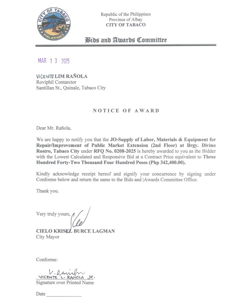 Notice of Award: JO-Supply of Labor, Materials & Equipment for Repair/Improvement of Public Market Extension (2nd Floor) at Brgy. Divino Rostro, Tabaco City, PR No. 25-02-0234 2025, Bids and Awards - Posted by: [ Melissa Biron] Download: Award Reso-25-02-0234 – Roviphil ContractorDownload Notice of Award-25-02-0234 – Roviphil Contractor Download Purchase Order-25-02-0234 – Roviphil Contractor Download